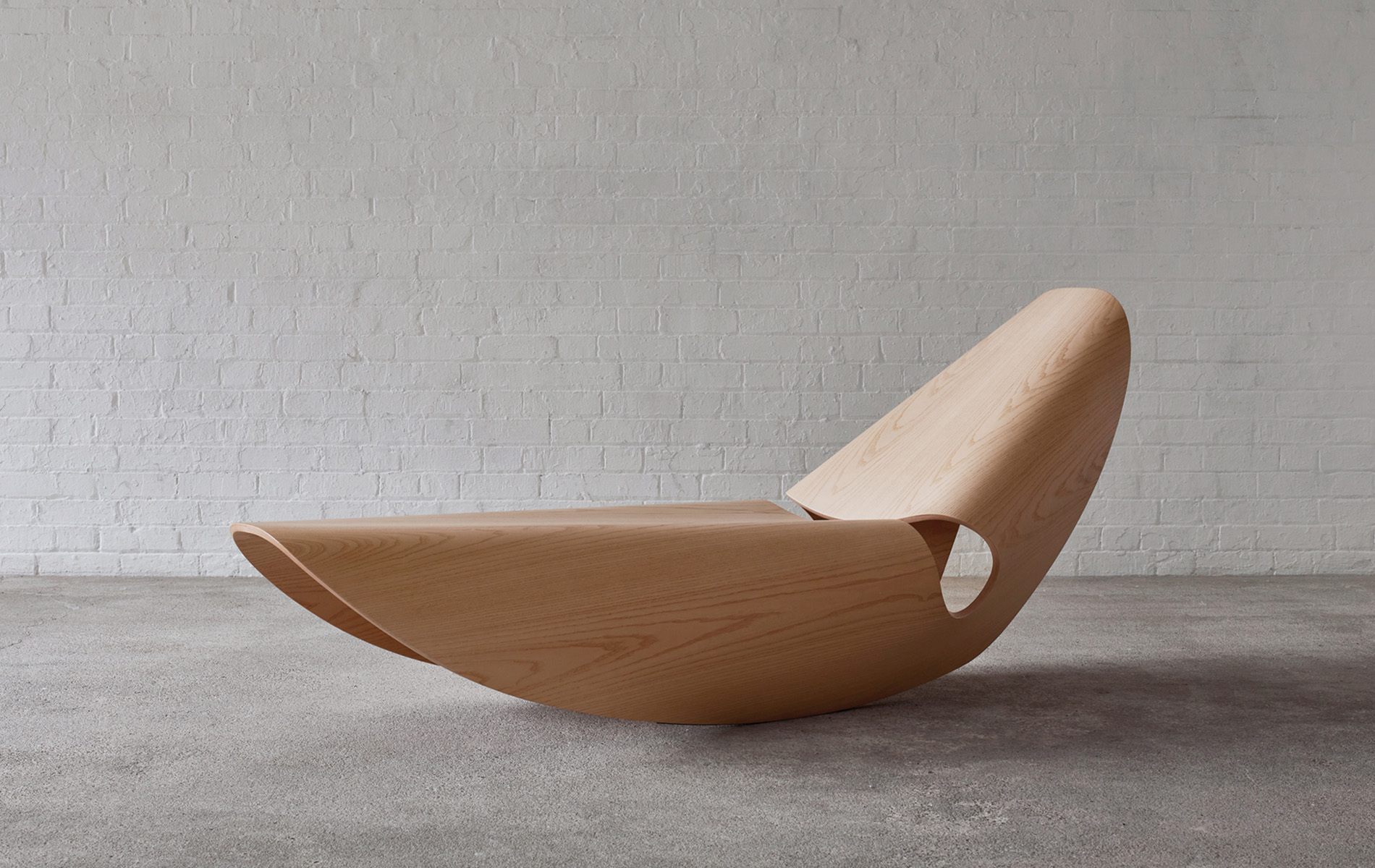 The Cowrie rocker is inspired by the concave lines of sea shells. The curvilinear form is the result of an extensive research and innovation process that bridges the handmade with the digital. Sweeping lines are displayed in a gentle, single surface monocoque fold. The all-in-one structure of the elegant rocking lounger is formed in bent plywood with either a walnut or natural or ebonised ash veneer.