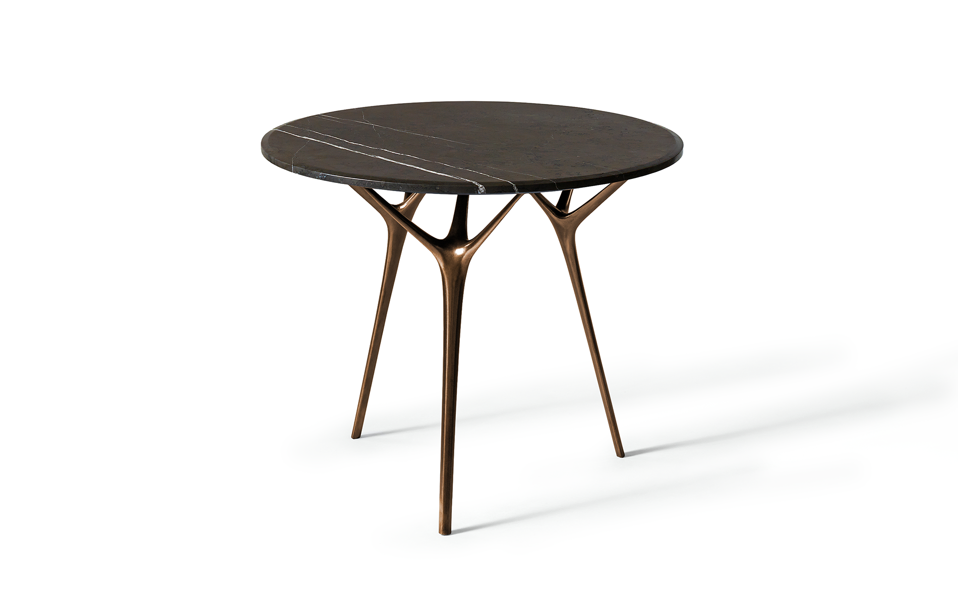 The biomorphic forms of the elegant Stellarnova legs are inspired by nature and sand cast in recycled aluminium or solid bronze with a patinated finish. Designed with a triangulated attachment point, each leg is self-supportive with the tabletop, reducing overall material and resulting in a more refined aesthetic. Completely modular, the legs can be positioned with tabletops of any shape and size.