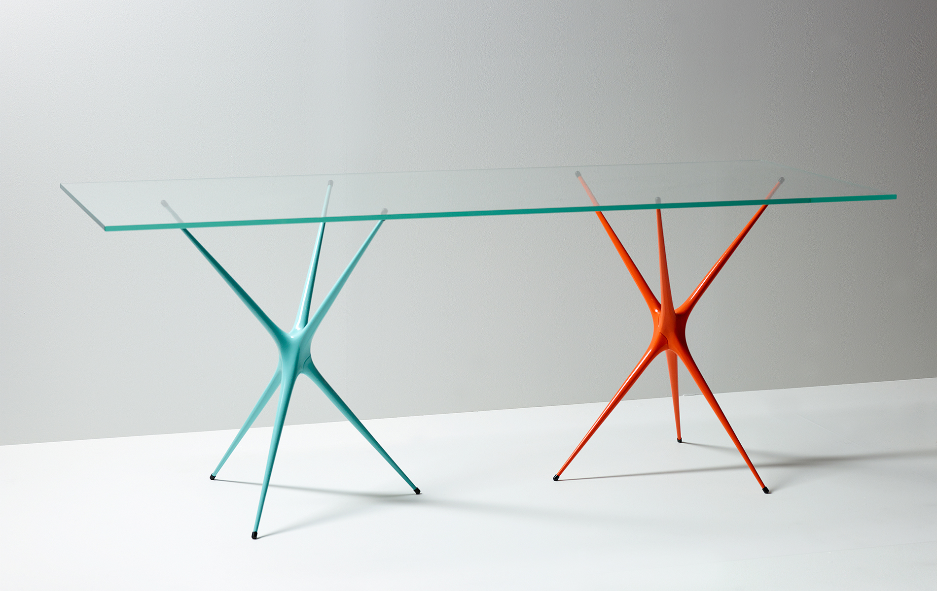 The Supernova is a dynamic, self-leveling trestle cast entirely from recycled aluminium with a toughened glass top. Simple and versatile to orientate, the star shaped structure can be positioned vertically for a high desk or dining table or horizontally for a low coffee table. The number of trestles can vary according to glass size and are available in sea green, bright orange, charcoal black, pure white or raw aluminium.
